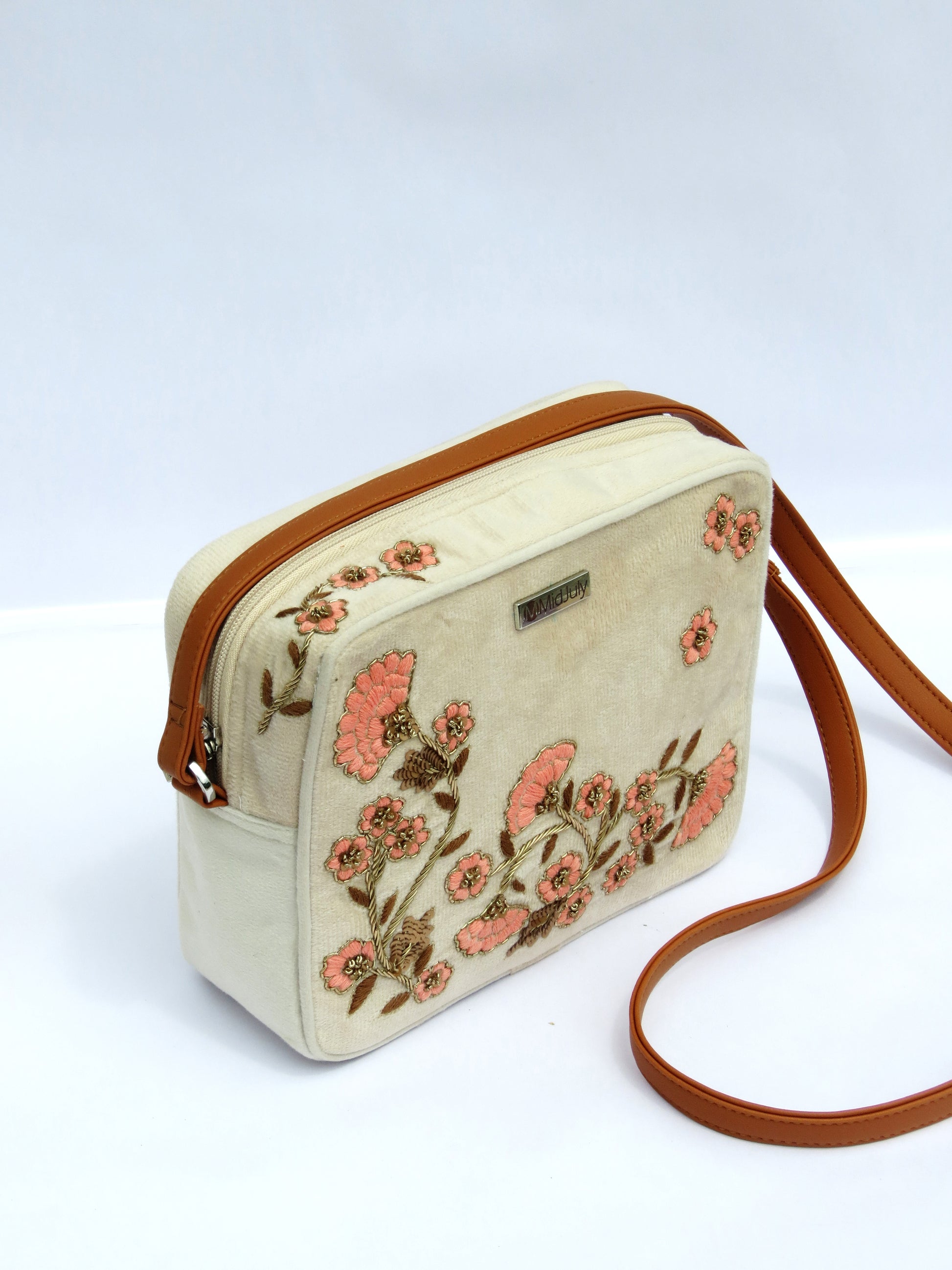 Exquisitely hand-embroidered with delicate blush-pink florals and leafy vines on a soft ivory base, it captures the grace of traditional craftsmanship in a contemporary form. The subtle contrast of tan leather straps and piping adds warmth and sophistication, making it perfect for both casual brunches and elegant evening outings.