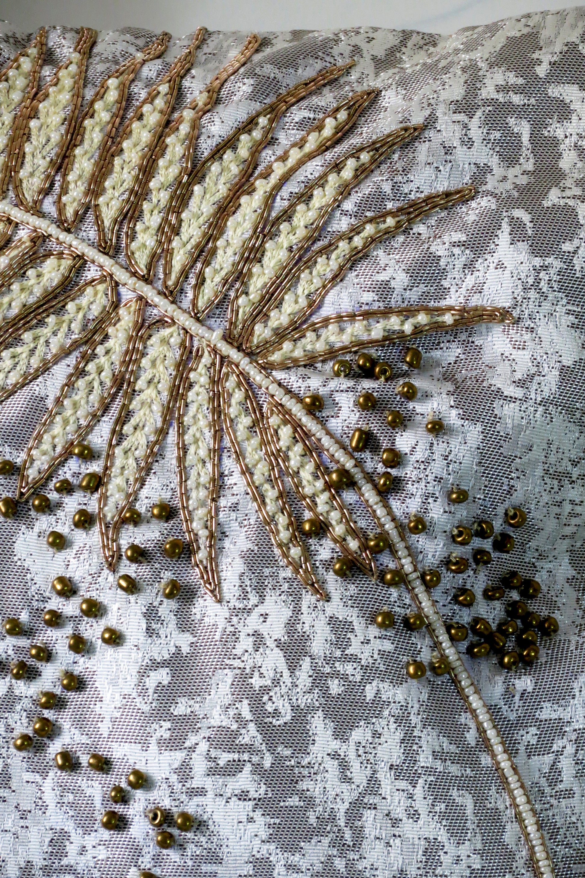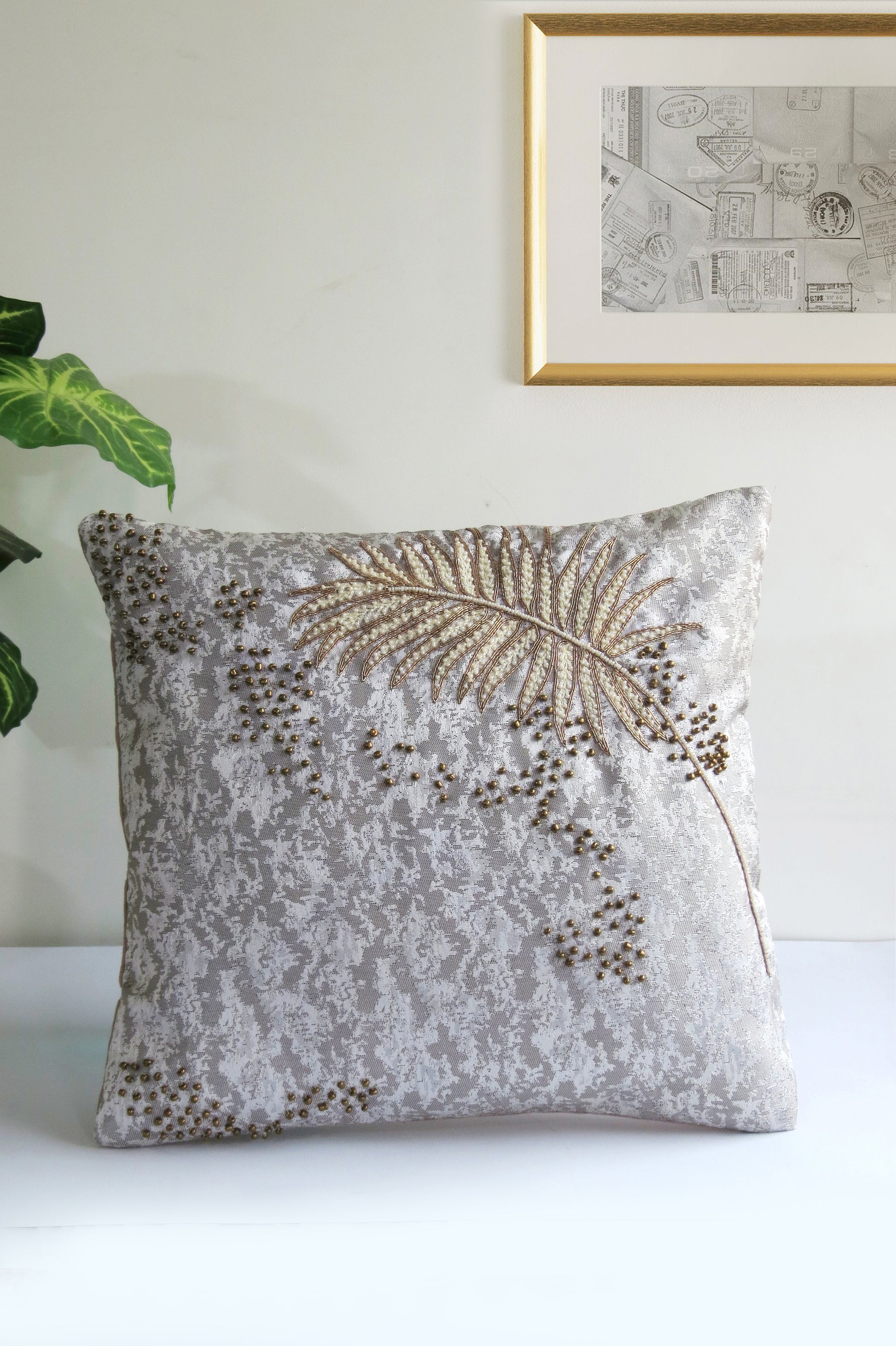 Desert Pearl,' a 16x16 inch handcrafted cushion cover crafted for your peaceful outdoor retreat. The textured pearl grey fabric echoes the subtle beauty of the desert, adorned with a hand-embroidered palm leaf in gleaming brass thread. Like precious pearls scattered by dawn, brass moti dots add an elegant touch. Elevate your outdoor cushions with 'Desert Pearl,' where each stitch narrates the tale of handmade serenity and the enchantment of desert palms in the morning haze.