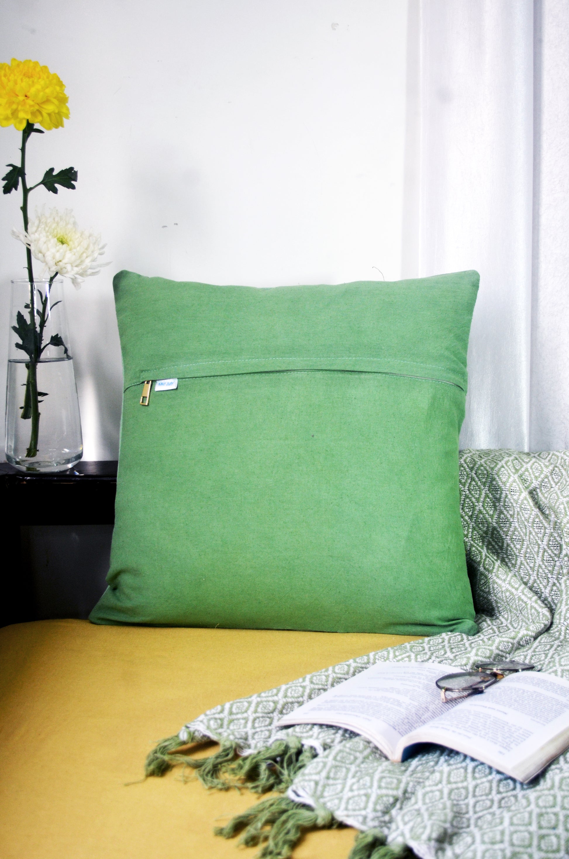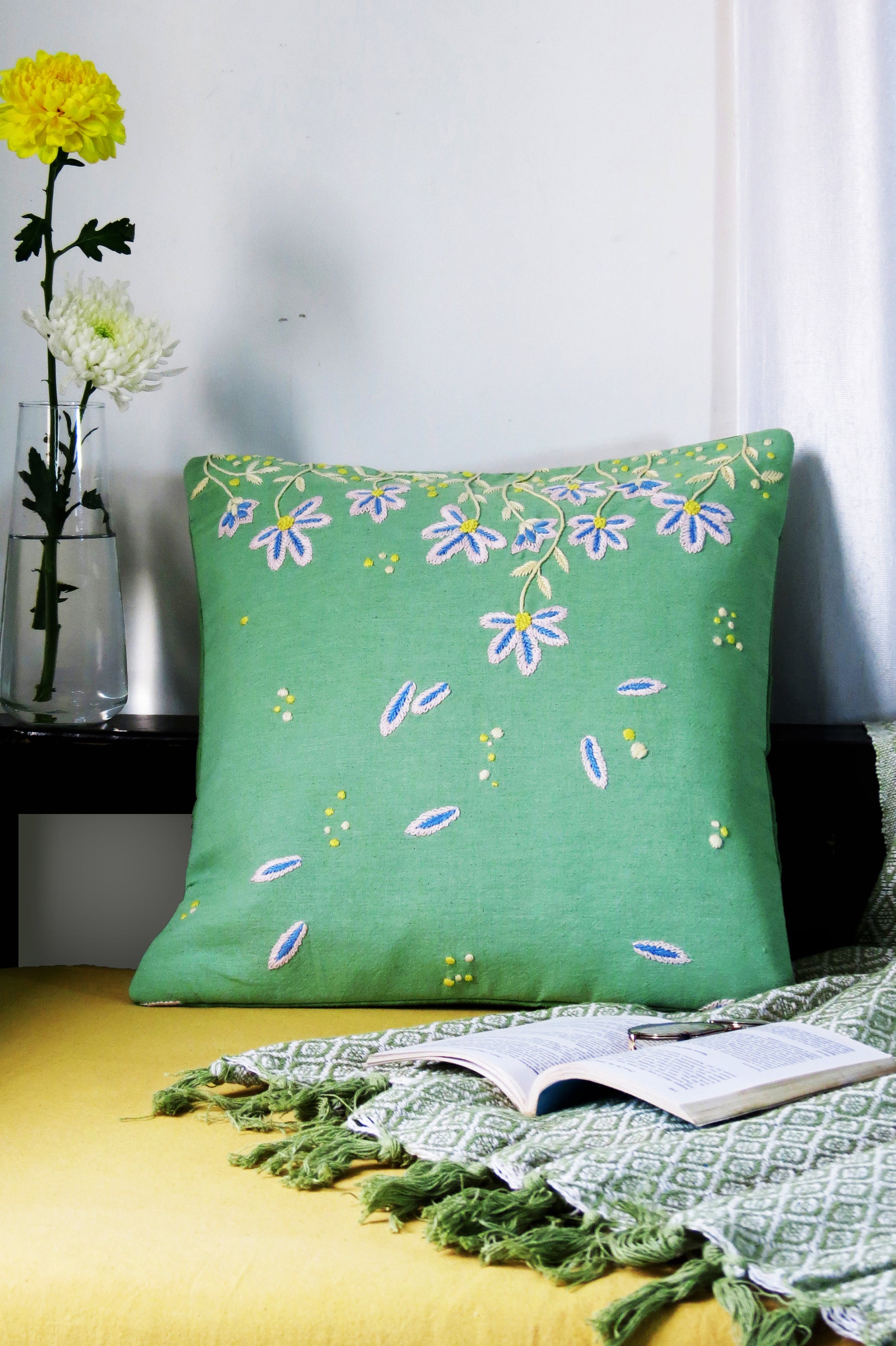 Feel the beauty of 'Mint Blossom,' a 16x16-inch cushion cover that brings the charm of handmade art to your outdoor space. The soothing mint green backdrop hosts hand-embroidered flowers in light pink and powder blue, showcasing the skill of hand embroidery. As petals gently fall, this chair cushion becomes a celebration of simple joys. 'Mint Blossom' isn't just a cushion; it's a crafted ode to nature's elegance. Transform your seating with this handmade creation, where comfort meets the warmth of Indian simplicity, and every stitch tells a story of care and craftsmanship.