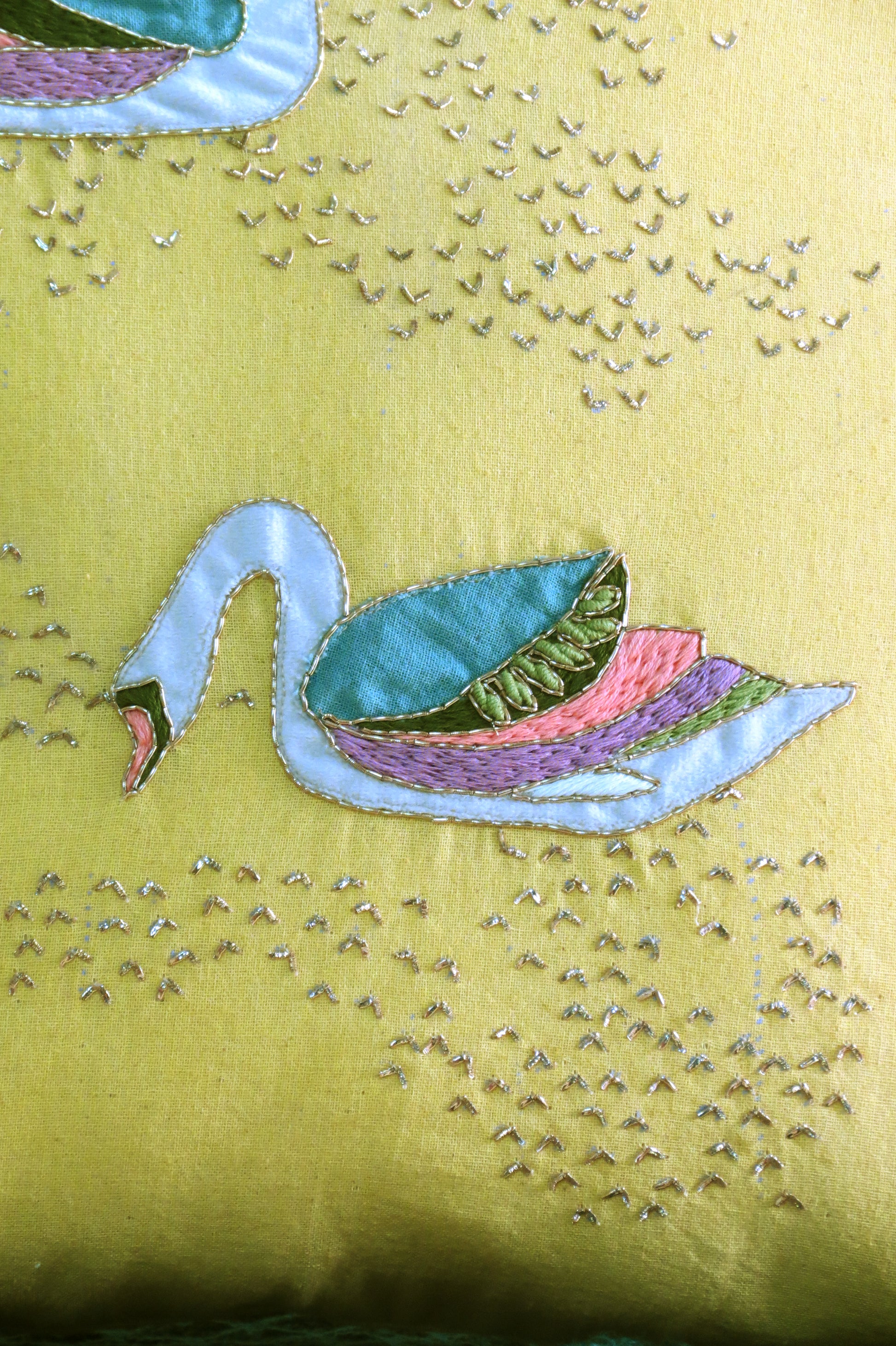 Experience the serene beauty of nature with our Swan Serenade cushion covers. Handcrafted with love, these covers feature a pair of swans gliding on a tranquil lake, brought to life by the traditional Zardozi embroidery technique. The pastel colors and the golden glow of the setting sun create a peaceful ambiance, perfect for any home decor. Made with high-quality materials, our cushion covers are not just beautiful, but also durable. Bring home the elegance of swans and the tranquility of nature with our Swan Serenade cushion covers.
