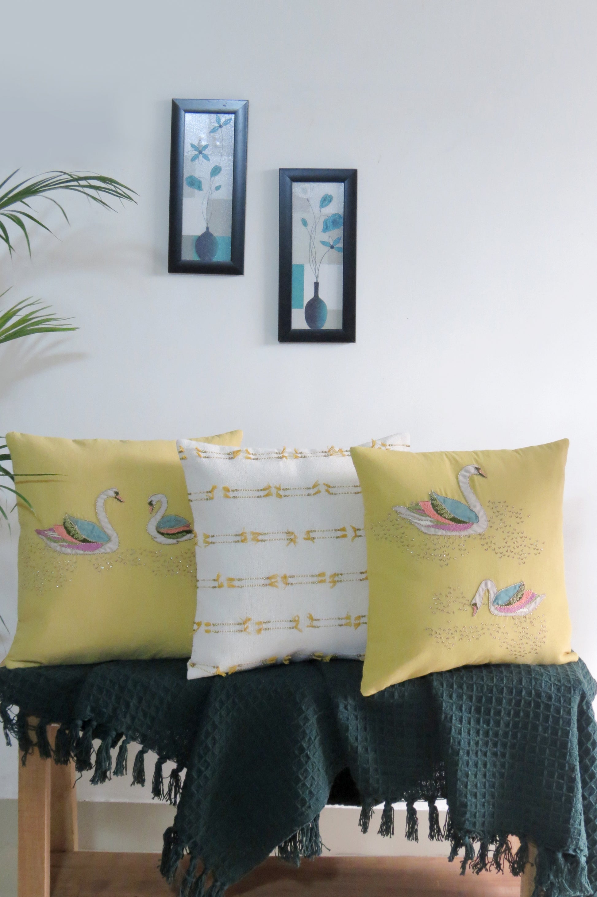 Hand embroidered Yellow cotton cushion covers Set of 3