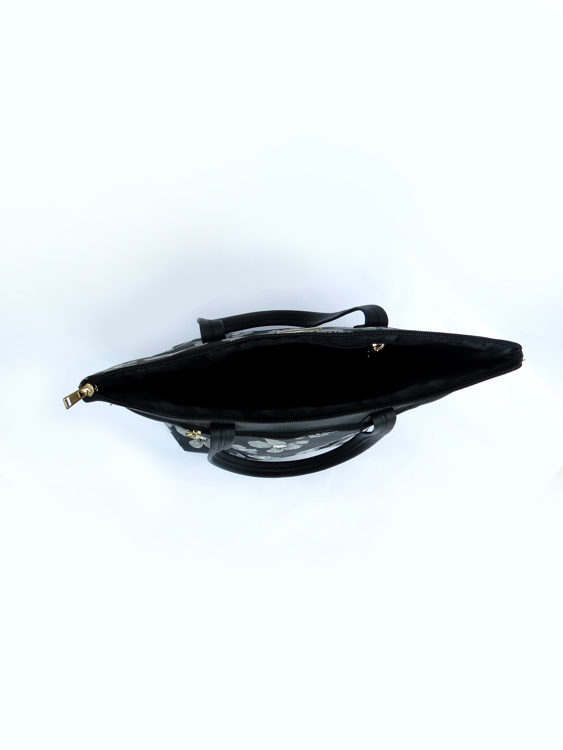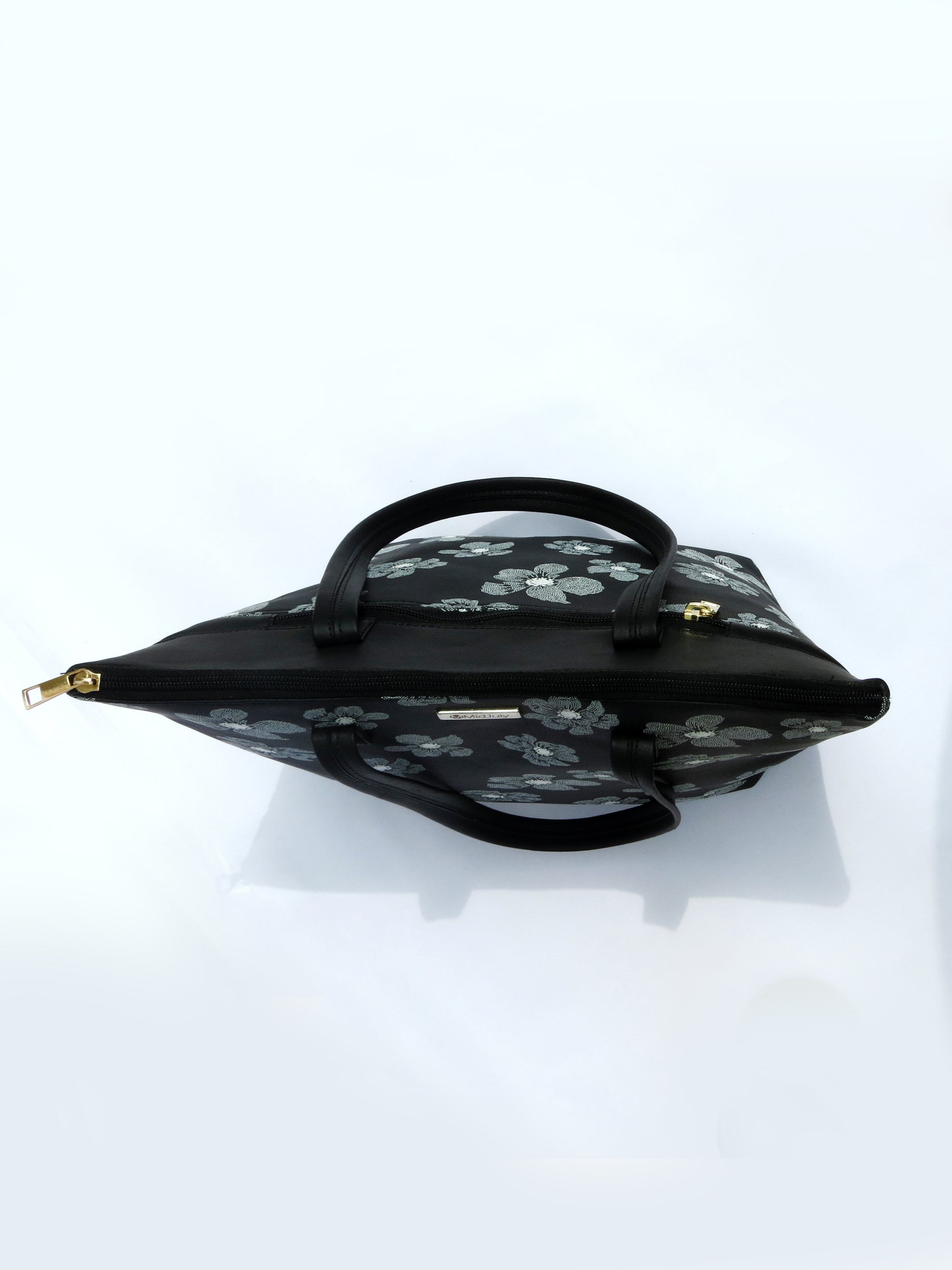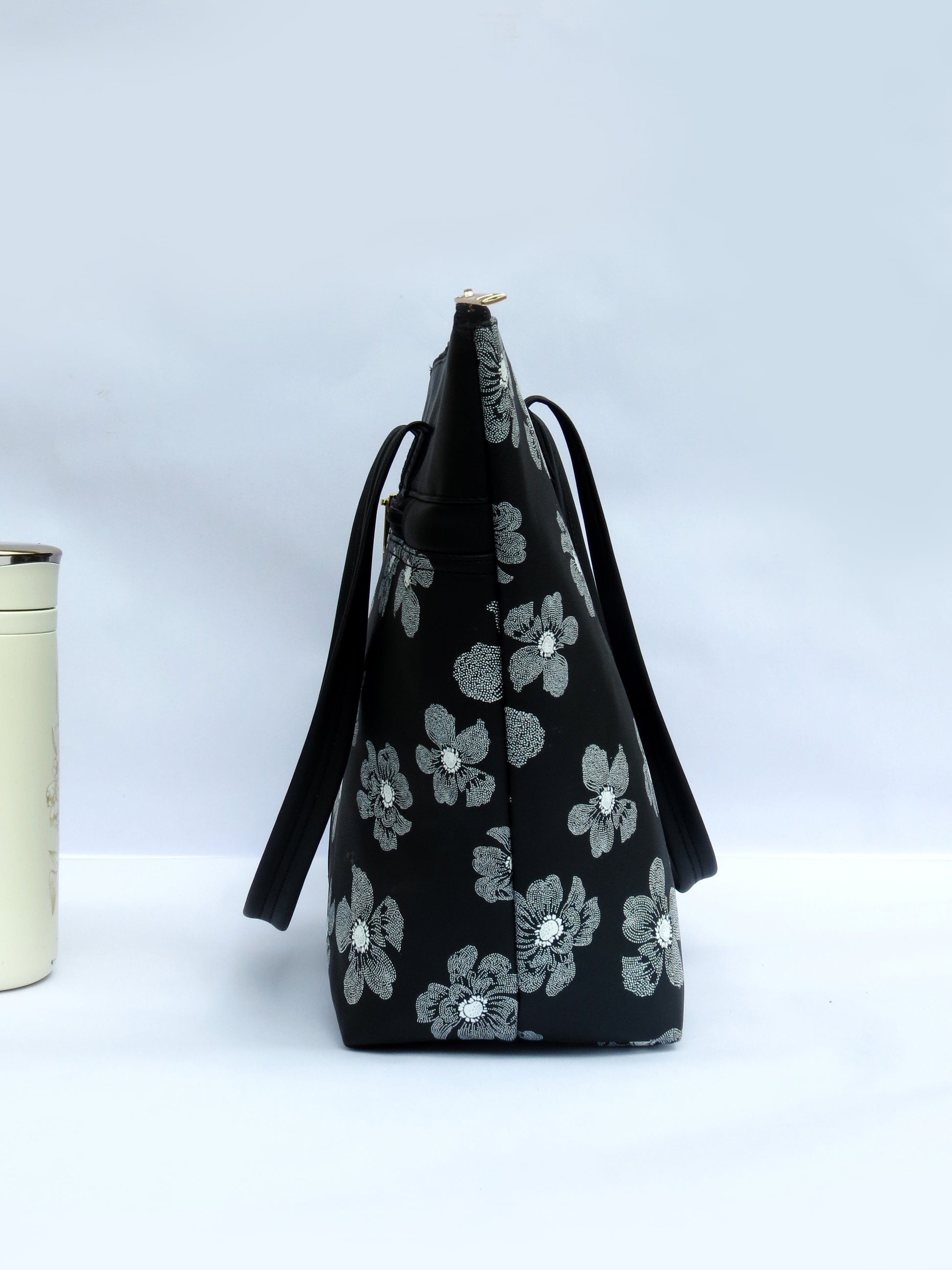 Crafted from premium vegan leather, the bag features soft white floral motifs blooming across a deep black base — creating a sophisticated contrast that complements any outfit. Its structured form, sturdy handles, and smooth zipper closure ensure both durability and style, making it your perfect daily companion.