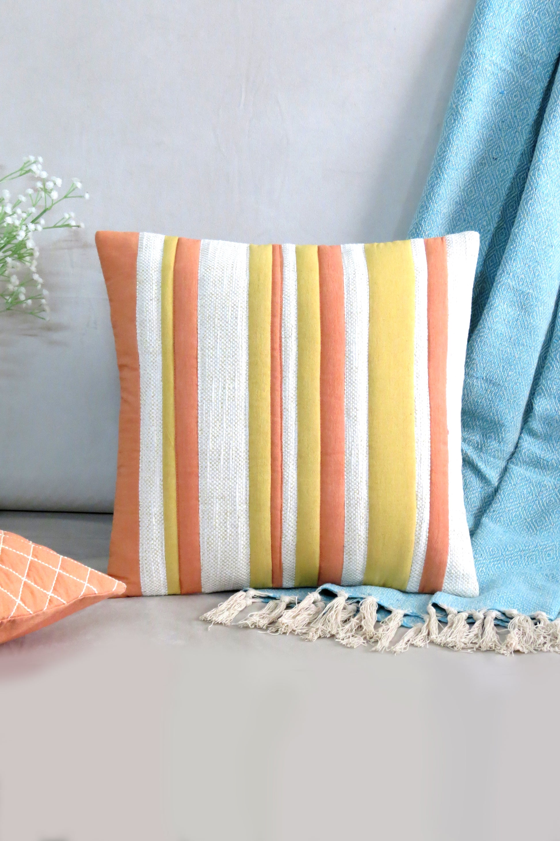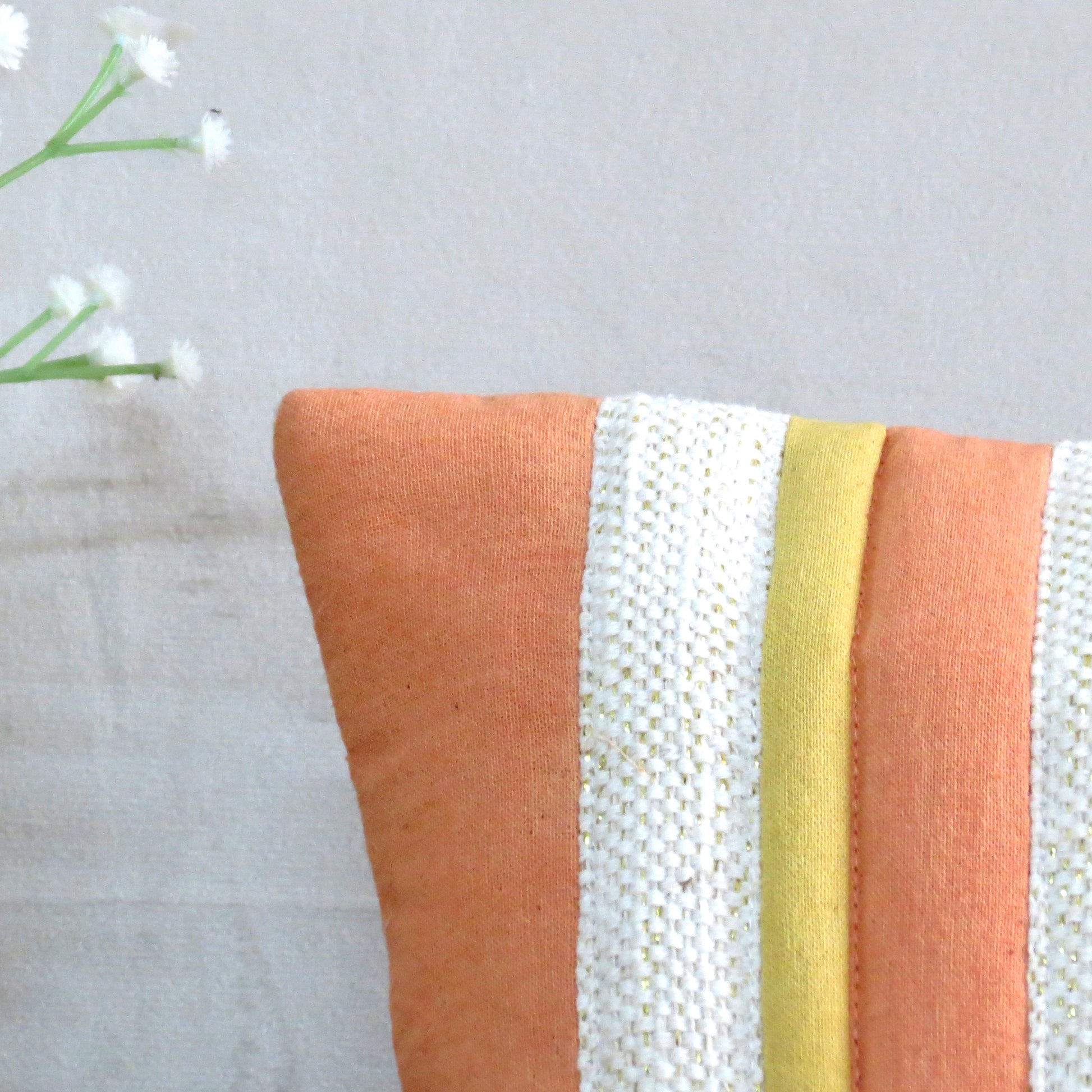 Peach and Yellow Fabric Panels Cotton Cushion Cover 16x16 Inches
