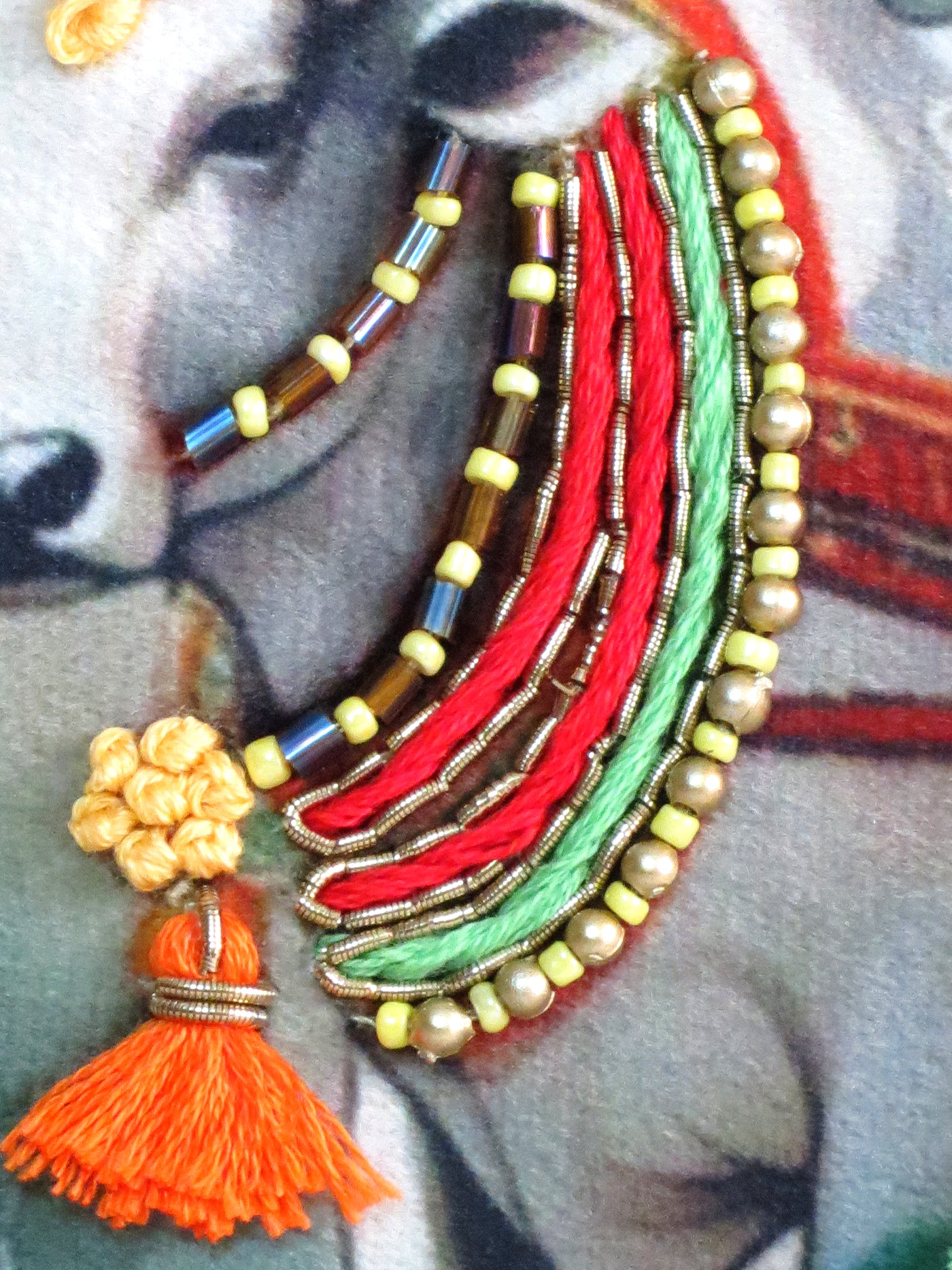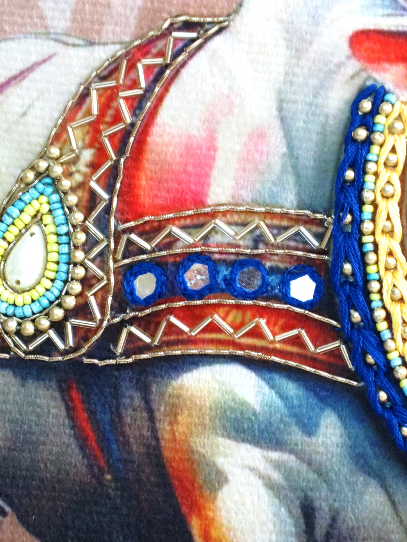 The oxen are depicted in various bright colors like red, yellow, green, and blue, with hand embroidery and zardozi technique adding a touch of luxury and elegance. The brown and beige background, reminiscent of a jungle abstract, provides a subtle contrast to the vibrant colors.