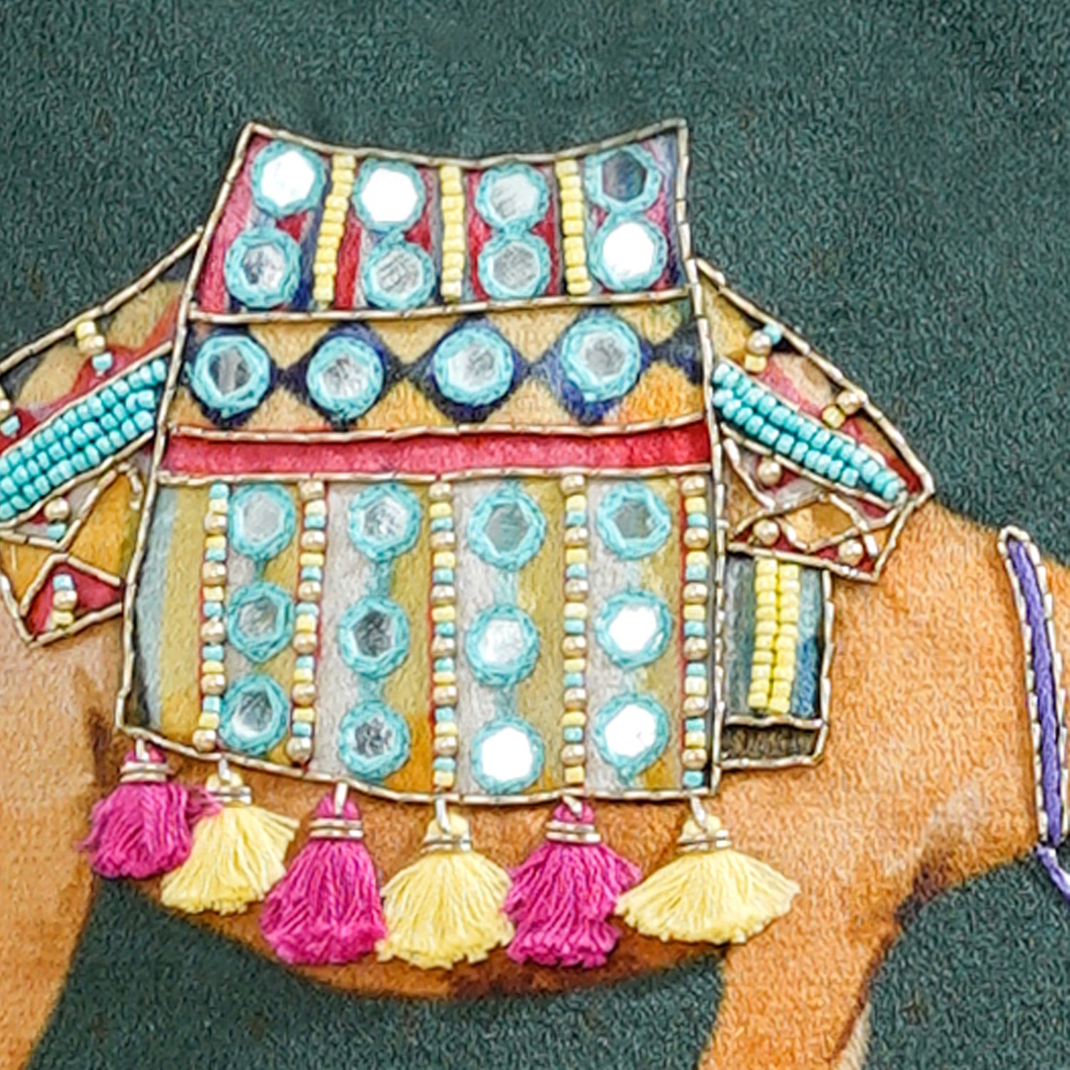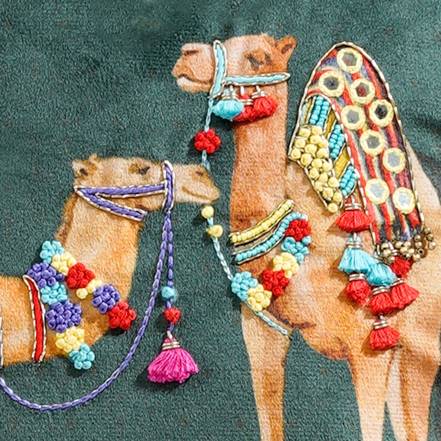 A collection of cushion covers titled "Royal Opulence" was inspired by this tradition. Each cover captured the festival's spirit, featuring the desert's vibrant colors, intricate patterns, and the camel's majestic presence.