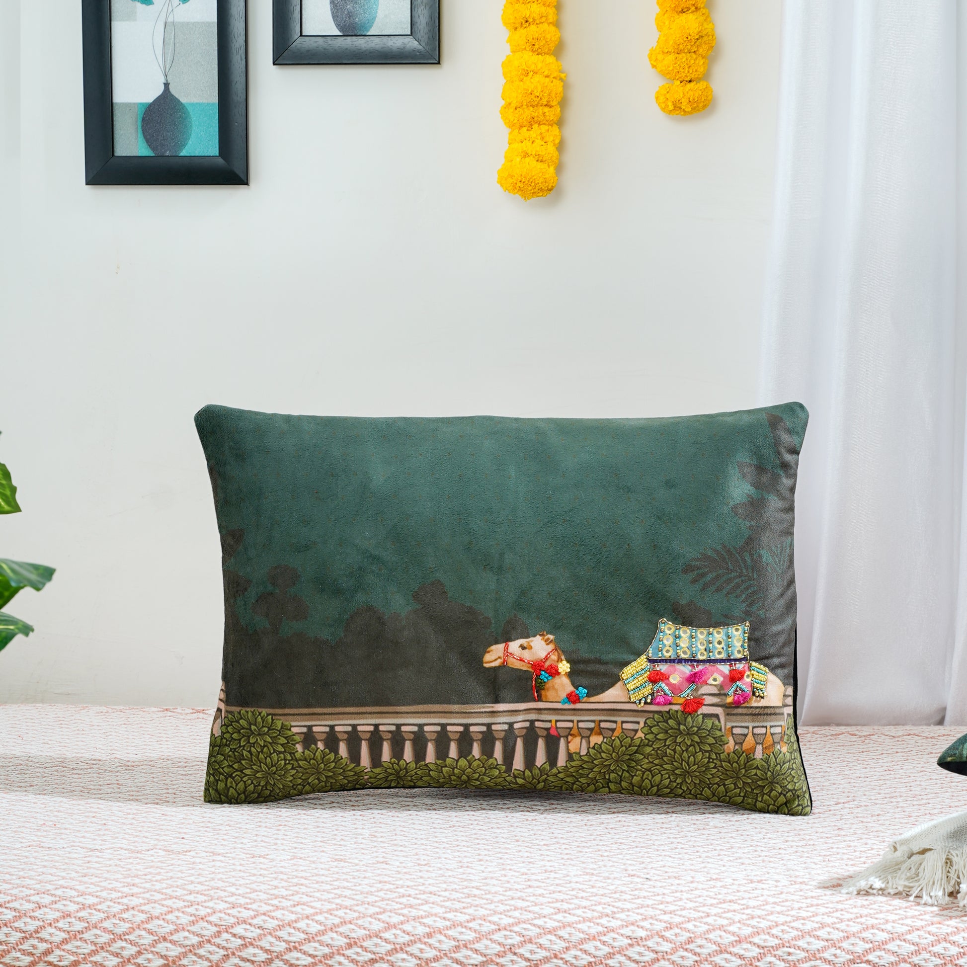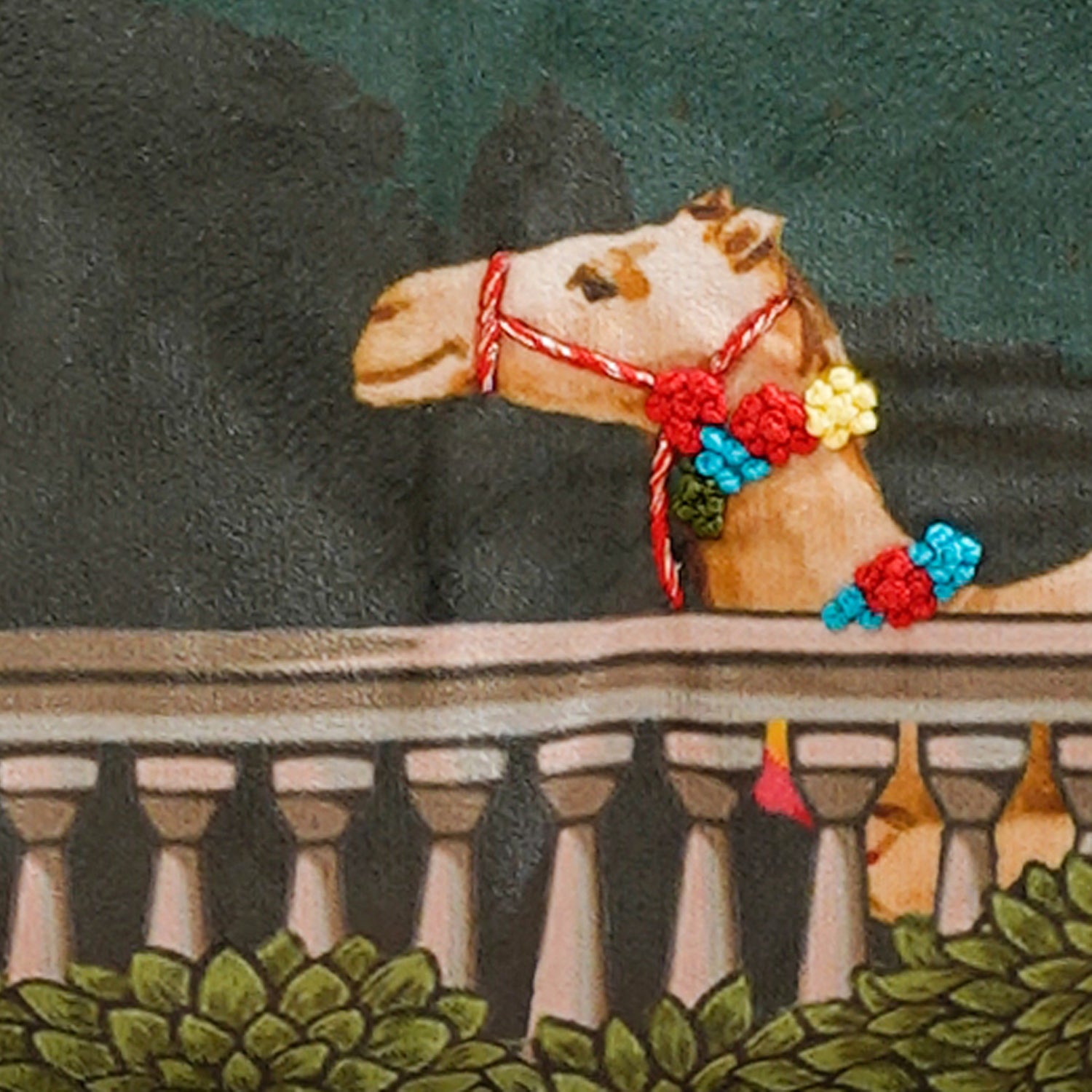 A collection of cushion covers titled "Royal Opulence" was inspired by this tradition. Each cover captured the festival's spirit, featuring the desert's vibrant colors, intricate patterns, and the camel's majestic presence.