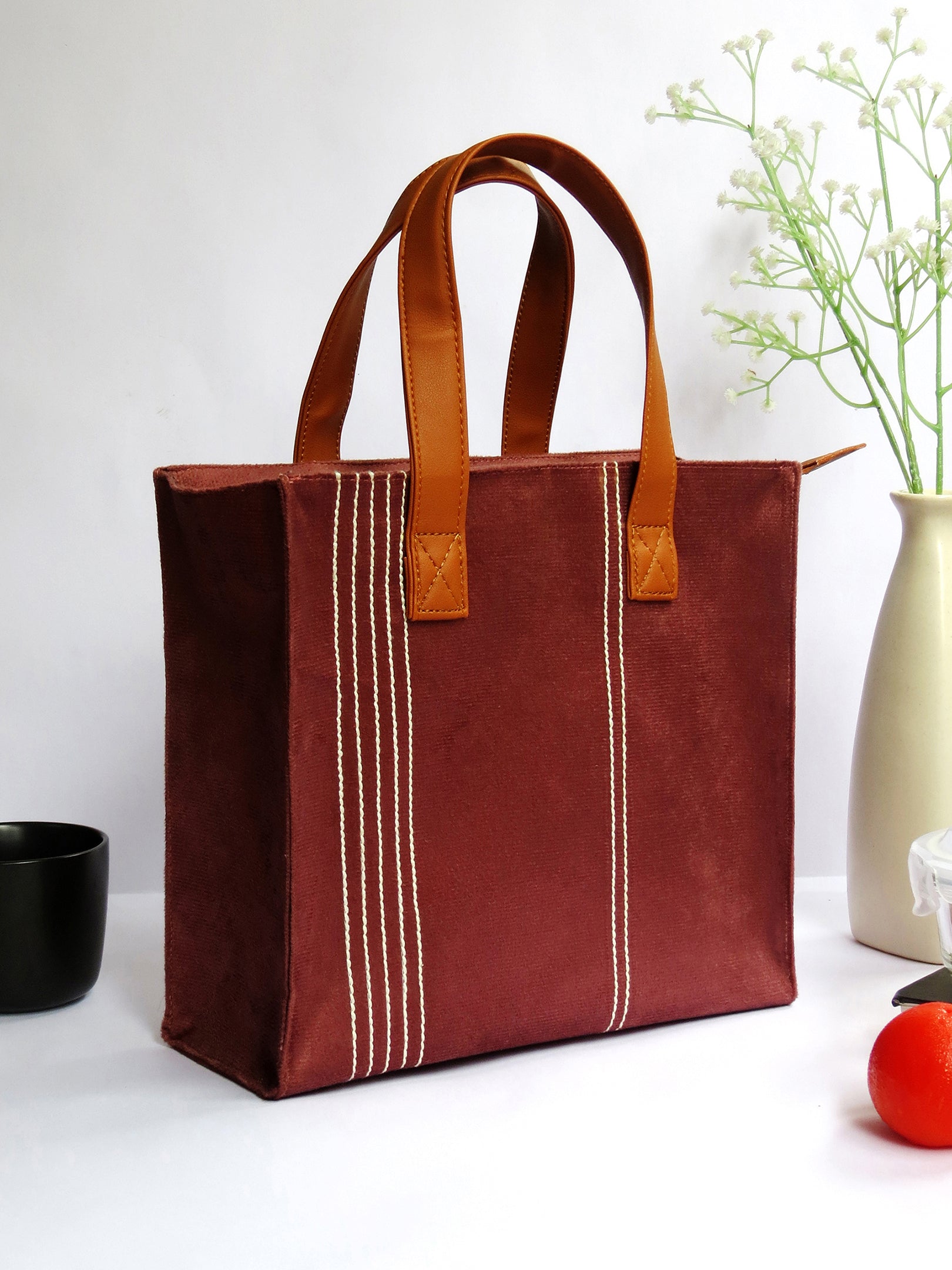 Bold, beautiful, and built for everyday use — this maroon velvet lunch bag is designed for people who like their daily essentials served with a side of style. Clean stitch lines and earthy vegan leather handles bring structure and strength, while the plush velvet adds an elegant touch.